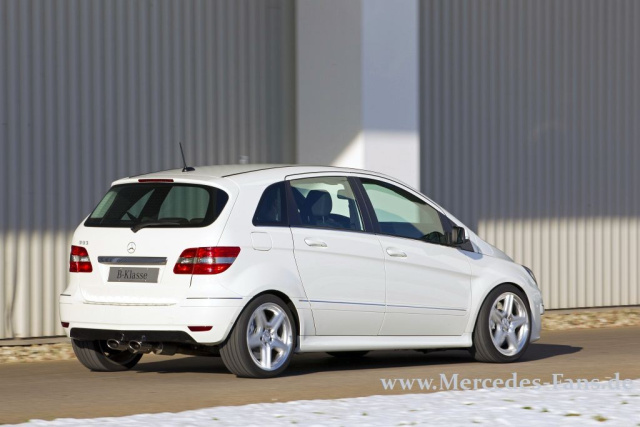 Von außen sieht ein unvoreingenommener Betrachter der B-Klasse ihre Verwandlung (oder sagen wir richtigerweise die Ausweitung ihres Potenzials) vermutlich gar nicht an. Das liegt natürlich auch daran, dass die verantwortlichen Kollegen, den für die Hinterachse erforderlichen Hilfsrahmen sehr geschickt in das Stahlkorsett integriert haben, die Kardanwelle verschwindet im Sandwichboden. Kennern fallen die dunkel lackierten Kühlerlamellen und die rauchdunklen Scheinwerfern auf. Aber die die mittig geführte doppelläufige Auspuffanlage ist da schon verräterischer. Das Prachtstück ist eine Sonderanfertigung aus verschiedenen Ersatzteilpositionen und klingt genauso gut wie sie ausschaut.