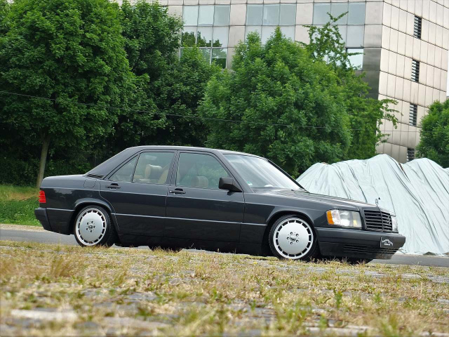 Die sportliche Verbeugung fällt bei diesem Exemplar eindrucksvoll tief aus. Mit H&R-Deep-Federn geht‘s für Torstens Mercedes-Benz 190 ganz schön weit runter. Minus 110 mm/85 mm VA/HA sollen die Tiefstände betragen.