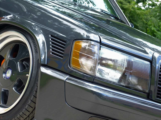 Obwohl sich das Designkleid des 190er nicht wesentlich anders als vor zwei Jahren präsentiert, schaut der Mercedes-Benz gleichwohl grundlegend verändert aus. Dieser Eindruck ergibt sich nicht nur aus der bereits erwähnten extremen Tieferlegung, sondern liegt zu einem Gutteil auch an den MAE-Rädern.