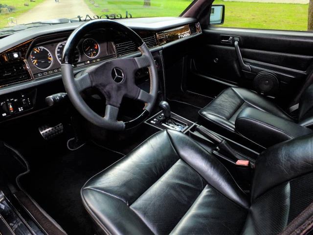 Die Dynamik, welche die optische Präsenz des W201-Exterieurs ausstrahlt, wird im Innenraum, der komplett von grauem Stoff auf schwarzes Leder/Alcantara umgerüstet wurde, gespiegelt. Mittlerweile ist auch das Edelholz-Dekor und der Holzschaltknauf Geschichte - nun sollen schwarzer Marmorlook dem Dekor als Zierde und ein schwarzer-Leder-Shifter vom R170 zur Bedienung der Automatik dienen.