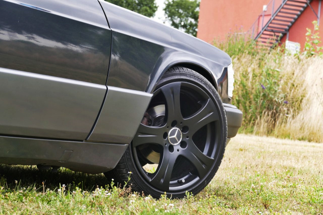 Die sportliche Positionierung auf dem Asphalt fällt bei Davids 118 PS starkem 190er recht gelungen aus. Mit H&R-Federn geht‘s für den Baby-Benz vorn wie hinten 40 mm abbwärts.