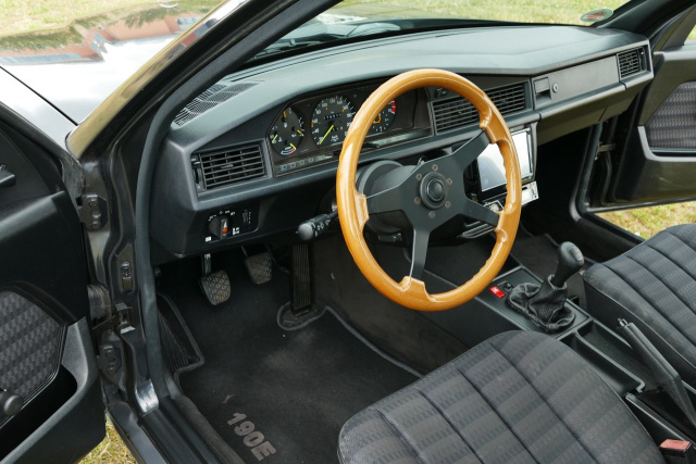 Dass es mitnichten immer rennsportliches Equipment sein muss, mit dem man einen Innenraum schön aufzuwerten vermag, beweist der Blick in den gepflegt anzusehenden Innenraum des Mercedes-Benz 190. Kein anderes Extra lenkt den Blick auf das ansehnliche Raid-5D Holzlenkrad ab. Somancher 190er hat an diesem Ort mehr zu bieten. Doch David kommt es nur auf das Wesentliche bei den inneren werten seines Mercedes-Benz 190 E an. „Um schöner in meinem Benz zu lenken, braucht es meiner Meinung nach nicht noch mehr Zubehör.“