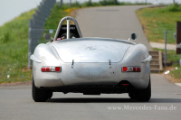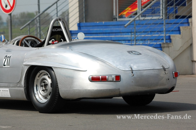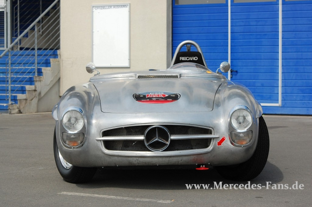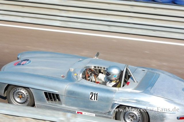 Das war schon ein merkwürdiges Bild, was sich dem Betrachter bei den Mercedes-Race Days in Oschersleben bot. Beim freien Training tummelte sich mitten bei der Musik zwischen 2.3-16V und AMG-Geräten ein 300 SL. Augenscheinlich nicht fertig restauriert. Das Blech war unlackiert, zeugte noch von Schleifspuren und die Windschutzscheibe war auch noch nicht montiert.
