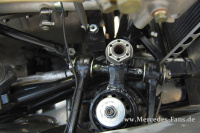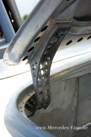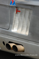 Die meisten SLS-Repliken fahren neben dem herkömmlichen Guss-Motor auch einen Gusseinlass. Weindlers Geschoss dagegen verfügt über einen Einlass aus Stahlblech, der nicht nur leichter ist, sondern auch dem Durchsatz weniger Widerstand bietet. Vermutlich ist dieser Ansaugtrakt das einzig verbliebene Original aus dem damaligen SLS-Programm. Der den Spezifikationen des original-SLS-Triebwerks entsprechende 3-Liter-Alu-Reihensechszylinder produziert bei 6.300 U/min runde 238 PS. Naja, und damit ist der rasende Steuerberater wie oben erwähnt auch ganz flott unterwegs. Von 0-100 km/h vergehen rund 4 Sekunden. Und natürlich fehlt nicht etwa wie eingangs beschrieben eine Windschutzscheibe, sie gehört einfach nicht an einen SLS! Eine Eingelenk-Pendelachse dagegen schon und eine 80 mm Tieferlegung sogar auch! 80 mm! Da pfeift ein junger Tuning-Freund aber anerkennend durch die Zähne! Respekt, Alter!