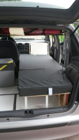 „Da im Herbst dieses Jahres ein Kroatienurlaub ansteht und mein Kollege eher der Typ „Rucksacktourist“ ist, wurde erstmals der Gedanke an einen Umbau ins Auge gefasst.Da traf es sich natürlich schon einmal gut, dass die hinteren Stühle sowie der Beifahrersitz problemlos ausgebaut werden können und auf diese Weise eine ebene Fläche im Fonds entsteht. Nach einer mehrwöchigen Planungsphase (Zeichnungen, Maß nehmen und Materialüberlegungen, welche Details werden benötigt), ging es dann ans Werk.“