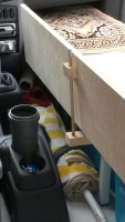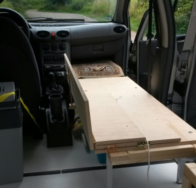 "Immer, wenn Zeit an den Wocheneden vorhanden war, wurde diese in den Innenausbau investiert. Das Untergestell für die Liegefläche wurde aus Kanthölzern und Tischbeinen aus dem Baumarkt gefertigt. Die klappbare Liegefläche bestehen aus Multiplexplatten. Klappbar deshalb, damit beim Fahren genug Platz vorhanden bleibt. „Die zusammengeklappte Liegefläche wird durch ein stabiles Stecksystem zusammengehalten, so dass hier während der Fahrt alles fest verankert ist und die Holzplatten beispielsweise nicht auf den Schalthebel fallen können.“