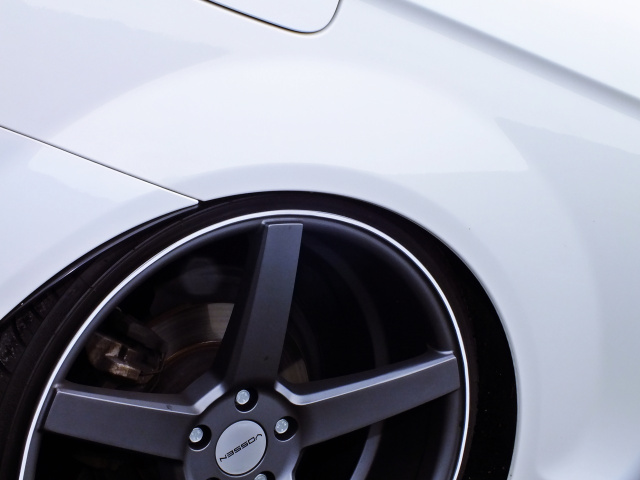 Schön anzusehen verschwinden in den Radhäusern die großen CVR-Vossen-Felgen in 8,5 x 20 Zoll, die mit 215/30er Nankang bereift sind, in der Versenkung. Das Titanfinish der Räder im sportiven Fünfspeichendesign setzt zur weißen Karosserie einen spannenden farblichen Kontrapunkt. „Die Wahl von Komponenten und Justierung verursachte bei den vorderen, nicht geweiteten Kotflügeln übrigens Probleme“, berichtet Florian, „Diese konnten aber durch Domlager mit Sturz gelöst werden.“