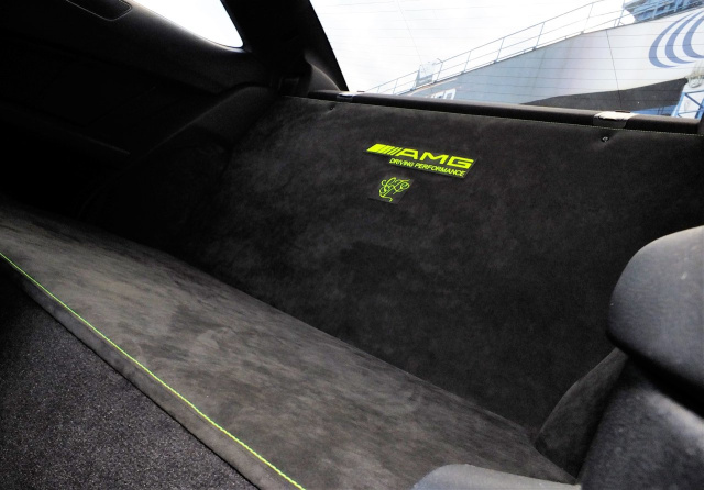 Innenraum: Kofferraum gestrippt, Rückbank entfernt (Platz mit dünner, mit Alcantara bezogener Holzplatte ausgefüllt) Alcantara-Lenkrad mit 12-Uhr-Markierung, Alcantara-Schalthebel mit AMG Symbol und gelben Ziernähten, Black-Series-Rennschalensitze