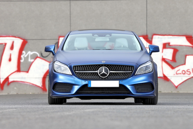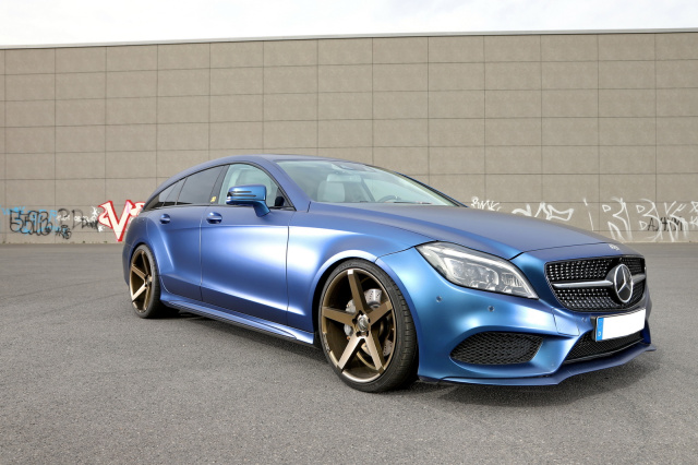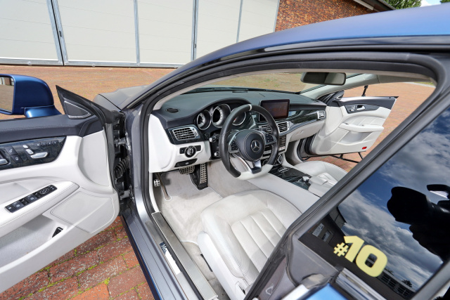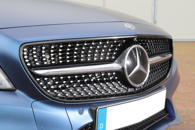 Das serienmäßige Palladium-Silber der Karosserie war an Langeweile kaum zu toppen. Von Anfang an war klar, dass hier wie bei meinen anderen Autos eine Vollfolierung hermusste. „Folienfelix“ aus Berlin bekam den Auftrag, ein sattes „Matte Blue Alu“ auf den Lack zu kleben. Dazu wurden alle Chromteile glanzschwarz foliert. Auch den vielen Chrom am Diamantgrill entschärfte Felix und ließ nur die Diamanten und zwei Wings neben dem Stern übrig. Ein schöner Kontrast zu den bronzefarbenen Felgen. Mehr wollte und brauchte ich an der AMG-Line-Außenhaut das CLS gar nicht machen.