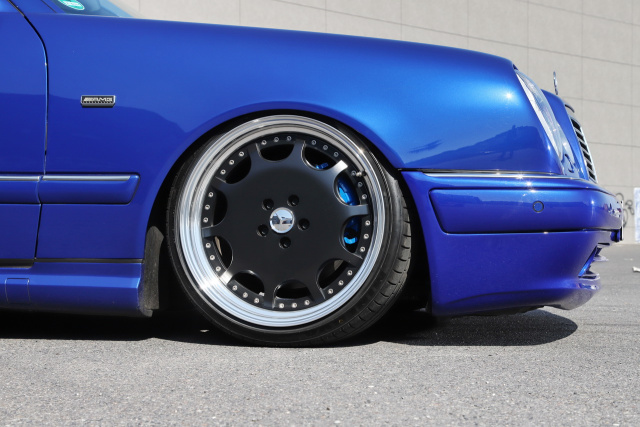 Das Ganze wirkt natürlich nur richtig mit dem entsprechenden Schuhwerk. Alex griff hier zu Dyna BR5 Rädern, die er in den Größen 9 und 10 x 19 Zoll an die Achsen schraubte. Bezogen sind die mattschwarzen Dreiteiler mit 225/35er und 255/30er Socken. Durch die kleinen Öffnungen der Felgen lassen sich nachgerüstete Bremsanlagen eines 430er Modells erspähen, deren Sättel blau lackiert wurden.