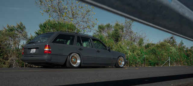 Rob hat Recht: Cool ist dieser Benz alleine schon deswegen, weil man ihn in den USA ja auch eher selten antritt. Noch cooler ist der Anblick des in Gunmetal-Grey neu lackierten Mercedes, weil sein Exterieur so makellos scheint, als wären die Jahrzehnte an ihm spurlos vorbeigezogen. Und obercool ist das Standing des 300 TE zudem wegen seiner extremen Tieferlegung - auch wenn sich am Thema Luftfahrwerk als Tuningmaßnahme die Geister bekanntlich scheiden.