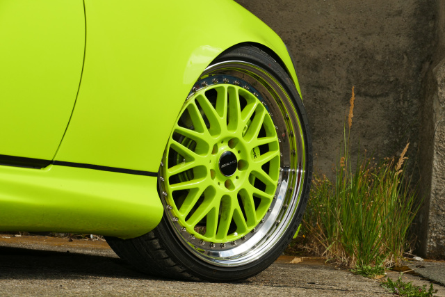 Karosserie: Lackierung in DIY-Farbe „Toxit-Green", LSD Doors, NTC-Frontstoßstange, Heckstoßstange mit Diffusor und Seitenschwellerleisten von Maxton, E-Klasse Spiegel mit schwarzem Gehäuse, Angel-Eyes-Frontscheinwerfer, schwarz getönte LED-Rückleuchten, Radläufe 10 mm gezogen vo/hi und gebördelt