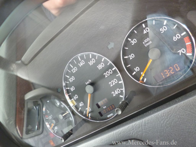 Die Instrumente sind nun mit Chrom-Ringen verschönert. Der Einbau ging zügig von der Hand. Außerdem sind noch zwei Chromringe für die Heizungsregler dazugekommen, um den Look des Armaturenträgers zu harmonisieren. Ferner sind nun Sonnenblenden der Baureihe W210 verbaut. Die Beleuchtung wurde auf weiße LEDs modifiziert.