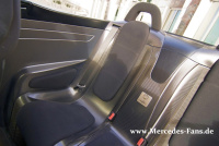 Carbon dominiert auch im Innenraum. Hier wurden Sitze, Türverkleidungen und Armaturentafel aus kohlefaserverstärktem Kunststoff gefertigt. Die originalen Schalensitze ließ Roger minimal aufpolstern, da er viel Langstrecke fährt. Seine bevorzugte Strecke ist die Autobahn Düsseldorf-Saint Tropez, wo er in regelmäßigen Abständen seine zwei Rennsport begeisterten Söhne besucht. Zwischen den hinteren Schalen-Sitzen hat sich Jean Alesi auf dem AMG Logo mittels Signatur verewigt.