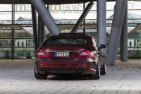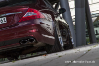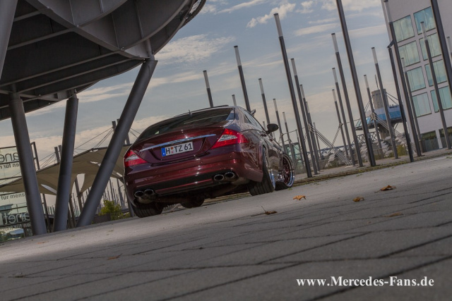 Nesat schwingt sich in den Fahrersitz und startet das V8-Aggregat. Im Display des Kombiinstruments erscheint das Chromewheel-Firmenlogo. Zum metallischen Sound des Kompressors gesellt sich das gierige Schlürfen der acht Töpfe bei kurzen Gasstößen. Die Auspuffanlage wurde etwas modifiziert. Eine X-Pipe verschärft den ohnehin sehr kernigen Klang des CLS.