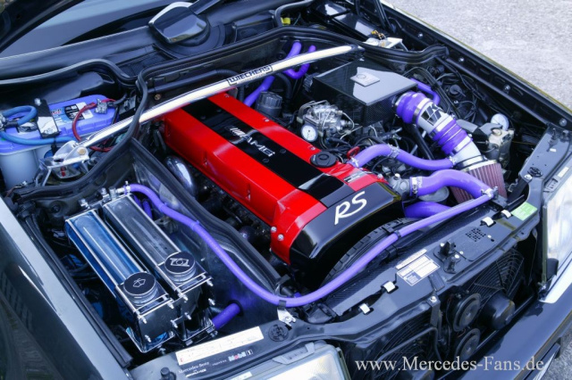 Nicht minder schmuck putzte Frank Pernicka den Motorraum heraus. Hier residiert der mächtige 3.0-Liter-Sechszylinder, dem die Mercedes-Konstrukteure bärenstarke 220 PS einhauchten. Interessante Modifikationen machen aus dem starken nun auch ein besonders schönes Stück Technik. So dokumentiert der glänzend rot lackierte Ventildeckel mit AMG-Signet die besondere Emotionalität des außergewöhnlichen Kraftwerks. In gleicher Weise verdingen sich die aus blauem vierlagigem Silikon gearbeiteten Kühlwasserschläuche, die in Spezialanfertigung bei tt-turbo entstanden.