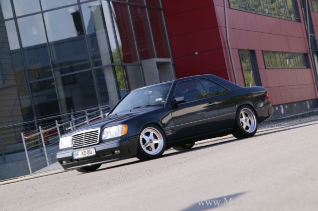 Ein Carlsson-Stoßfänger im AMG-Look bewirkt im Teamwork mit den 500E-Scheinwerfern eine deutliche Imagesteigerung. Des weiteren steuerte das Topmodell der ab 1993 von Mercedes-Benz in E-Klasse umgetauften Baureihe die imposante Heckklappe bei. Rote Rückleuchten (mit US-Lampenträger) und US-Blinker vorne mit integriertem Standlicht versehen das Arrangement mit stimmigen Highlights.