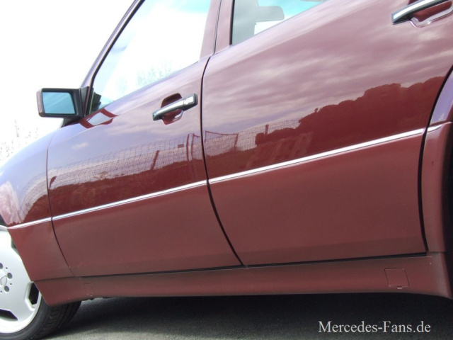 Als Modell des Baujahres 1992 zeigt der W124 von Oksana Visnevskaja die Segnungen der ersten Modellpflege vom Herbst 1989. Soll heißen, dass der Mercedes über die prägnanten seitlichen Flankenschutz-Leisten verfügt. An ihrer Oberkante sind werksseitig schmale Zierleisten aus poliertem Edelstahl angebracht. Diese Leisten schmücken auch die Oberseiten von Front- und Heckstoßfänger. Außerdem glänzt die Modellpflege und somit auch unser Fotomodell mit verchromte Einlagen an den Türgriffen