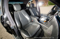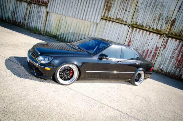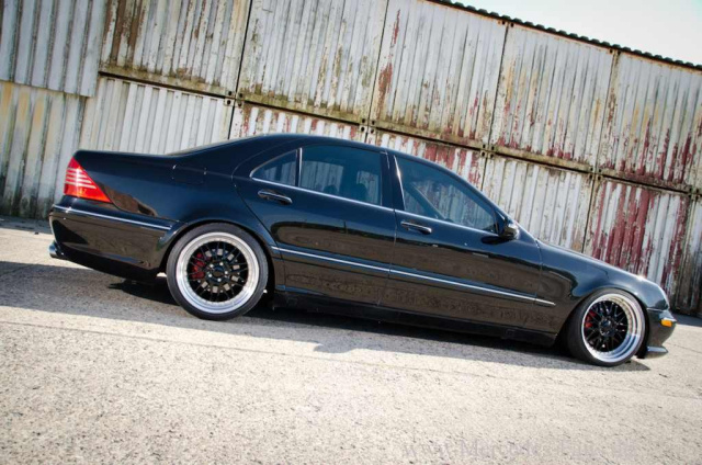 Zum glänzenden Eindruck der Mercedes S-Klasse gehört nicht nur der frische schwarze Anstrich, sondenr auch die sehenswerte Senkung. Für die Tiefenwirkung wurde die Airmatik mit Koppelstangen und einem Modul angepasst.