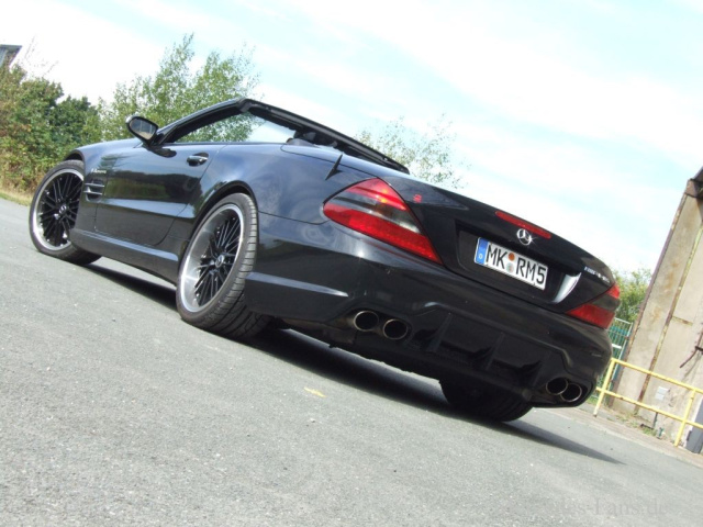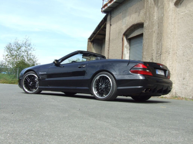 Das Erscheinungsbild des schwarzen Roadsters offenbart, dass der Mercedes auch in optischen Belangen einigen Modifikationen unterzogen wurde. Front-und Heckstoßfänger sowie der Diffusor in Gestalt des Nachfolgemodells Mercedes SL63 AMG bewirken eine spürbare Verjüngung des ohnedies attraktiven Looks.