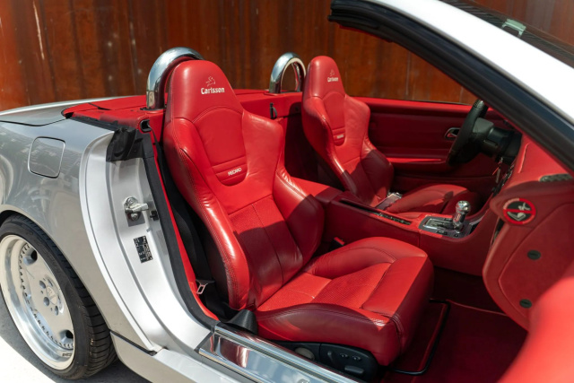 Der Innenraum wurde ebenfalls umfassend aufgewertet: Recaro-Sportsitze mit rotem Lederbezug, elektrischer Verstellung, Heizung und Belüftung bilden das Zentrum des Innenraums. Carlsson-Stickereien auf den Kopfstützen sowie einheitlich gestaltete Türverkleidungen, Mittelkonsole und Armaturenbrett unterstreichen das Konzept.