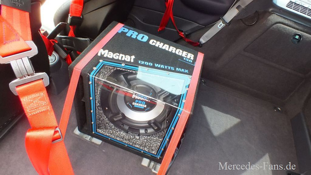 Die Car-Hifi wird mittels Alpine-Headunit gesteuert. Eine Renegade-Endstufe versetzt die Kalotten sowohl der vorne und hinten verbauten Bose-Lautsprecher als auch des Magnat-Subwoofers tüchtig in Schwingung. Ein Hifonics-Kondensator sichert die Stromversorgung des Incar-Entertainments ab. Last but not least verleihen komplett gedämmte Türen dem Sound mehr Fülle.