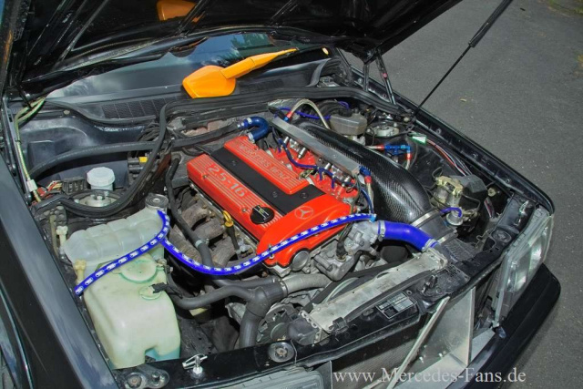 Der serienmäßige Output des agilen Mercedes 2.5-16V beträgt bereits beachtliche 191 PS. Damit ist der Mercedes zweifellos schon recht flott unterwegs, urteilt Thomas Kiefer. Aber in Anbetracht der sportlichen Erfolge, die der W201 seinerzeit für die Marke mit dem Stern errang, wollte ich meinen Mercedes dementsprechend konsequent auf Leistung und Fahrdynamik trimmen.