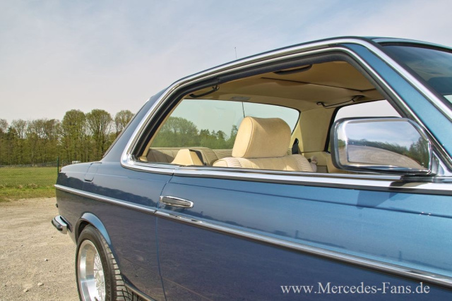 Nicht geschwärzt, sondern ganz weiß sind die neuen Frontblinkergläser. Ein weiteres Stylingmerkmal für ein sportliches Erscheinungsbild ist die Spurverbreiterung an der Hinterachse um 20 mm sowie die Tieferlegung des Mercedes per Fintec-Federn (minus 30 mm/35 mm VA/HA). Die Senkung des W123 Coupé betont zusätzlich dessen sportliche Karosserielinie. An der Hinterachse ist der Benz nachträglich mit Niveaudämpfern ausgestattet worden, welche sich in der Höhe mit einem manuell bedienbaren Kompressor justieren lassen. Auf diese Weise kann ich den 230 CE schön in Keilform bringen freut sich André Free.