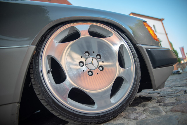 Gleichwohl ging es mit dem W124 abwärts. Das liegt an dem Luftfahrwerk aus dem Hause TA-Technix. Ins Rollen kommt der 230 E auf originalen Mercedes Segin Felgen in 18 Zoll. Um das Heck ein wenig aufzuwerten fand Stefan eine originale Heckblende aus dem Hause Climair.