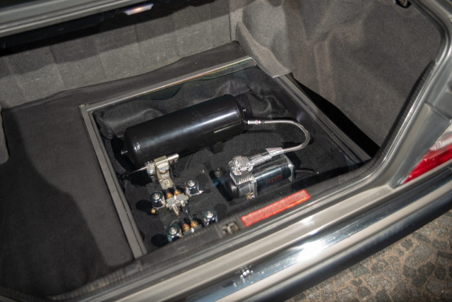 Kompressor und Tank des Luftfahrwerks fanden in der Reserveradmulde Platz. Um die Sehenswürdigkeit der Vorrichtung zu steigern, sind hier die Elemente des Airrides auf drei Ebenen verteilt und werden zudem von einer transparenten Plexiglasplatte gedeckelt.