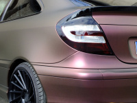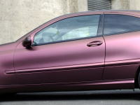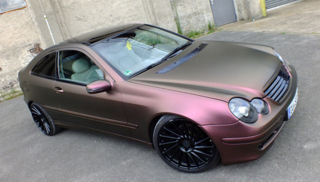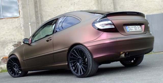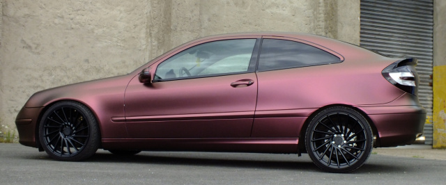 “Sparkling Berry“ lautet die Bezeichnung für den reizvoll chargierenden Farbeffekt, den eine Folie auf die Karosserie des Mercedes zaubert. „Damit ist dem Sportcoupé die Aufmerksamkeit sicher“, findet Sascha. Denn seidig matt schimmernd sticht der Mercedes C200 Kompressor zweifellos deutlicher aus der Masse hervor als in seiner originalen Lackierung in Smaragdschwarz-Metallic.