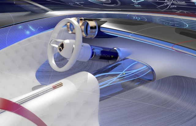 Kontrastierend dazu sind andere Anzeigeelemente digital in ein umlaufendes Glaszierteil integriert. So können beispielsweise Informationen über den Sitz auf dem digitalen Band abgebildet werden. Zudem werden im frontalen Bereich der Fläche Karteninformationen gezeigt. Menü-Inhalte werden über eine digitale Linie verlängert. Diese reicht seitlich bis zu den Insassen, die ergonomisch über das Berühren ihre Inhalte einstellen können. Die Frontscheibe dient als transparentes Display: Über ihre volle Breite werden fahrrelevante Daten sowie geografische Informationen dargestellt. Damit wird die Außenwelt mit augmentierten Informationen angereichert. Diese Informationen können über Gesten der Insassen gesteuert und angepasst werden.