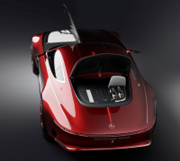 Klar gestaltete Flächen und organisch geformte Kotflügel stehen in Kontrast zur präzisen, lang gezogenen Kante. Diese scharf gezeichnete Charakterlinie auf jeder Seite definiert den oberen Fahrzeugkörper vom Kühlergrill über die komplette Fahrzeuglänge bis zum Heck. Darunter bestimmt ein volles muskulöses Volumen, das sich über die gesamte Flanke zieht, den sportlich gewölbten Grundkörper. Spannungsreich ist auch das Zusammenspiel der roten Lackierung in „Maybach-Red“ und der Chromleisten, die oben auf der Kotflügelkante sowie mittig auf Motorhaube und Heckdeckel sitzen. Die Neuinterpretation des Mercedes-Maybach Grills mit seinen feinen senkrechten Streben akzentuiert die Front. Inspiriert wurde der Grill von einem Nadelstreifen-Anzug. Der Kühlergrill stützt sich auf zwei aerodynamisch gestaltete Leitflächen rechts und links außen im Stoßfänger.