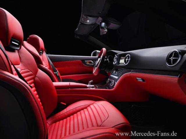 Sein athletisch geschärftes Profil paart der neue SL, der Mercedes-Benz Tradition folgend, mit luxuriösem Ambiente. Edle Materialien, mit Liebe zum Detail präzise verarbeitet, prägen Stil und Charakter des Interieurs. Im Vergleich zum Vorgänger legt die neue Generation des SL deutlich in Länge 4612 mm (+50 mm) und Breite 1877 mm (+57 mm) zu. Das erlaubt auch im Innenraum mehr Platz für mehr Komfort. Schulterraum (+37 mm) und Ellenbogenfreiheit (+28 mm) wuchsen und überragen die in dieser Fahrzeugklasse üblichen Maße. In diesem bequemen Platz bietenden Innenraum schaffen klare Linien ein formal stimmiges Interieur. Üppig verwendete Holz-Zierelemente setzen sich von der Mittelkonsole über die Instrumententafel in die Türen fort und sorgen für einen angenehmen Wrap-around-Effekt. Zur Auswahl stehen drei Holzarten sowie zwei verschieden behandelte Aluminium-Zierelemente. Wie es dem Charakter des Roadsters entspricht, vereint es die schnörkellose Atmosphäre eines Hochleistungssportwagens mit einem komfortablen und stilvollen Ambiente, das man sich in einem luxuriösen Reisefahrzeug wünscht.