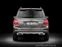 Der hintere Stoßfänger verleiht dem GLK-Heck mit der breitenbetonten Ausprägung und den filigranen Rückleuchten einen sportlich-souveränen Auftritt. Hier fällt besonders der neu gestylte optische Unterschutz wahlweise in Chrom und die ebenfalls serienmäßig verchromten Endrohrblenden auf. Die Heckleuchten haben die Designer sowohl optisch wie funktional komplett neu gestaltet. Durch die Verwendung von Lichtleitern und LEDs strahlt das GLK-Heck überdies in einem einzigartigen und charakteristischen Nachtdesign, zusätzlich unterstrichen durch die neue LED-Kennzeichenleuchte. Mit der Modellpflege haben die Designer auch neue Räder der Größen 43,2 cm (17-Zoll), 48,3 cm (19-Zoll) und 50,8 cm (20-Zoll) entworfen, die in verschiedenen Lackierungen oder mit einer glanzgedrehten Oberfläche angeboten werden. Dabei ist auch ein aerodynamisch optimiertes 43,2 cm (17‑Zoll) Rad lieferbar.