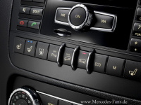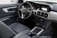 Design, Wertanmutung und Materialauswahl des neu gestalteten GLK‑Innenraums liegen auf dem Niveau höherer Fahrzeugklassen. Die Innenarchitekten des Mercedes-Benz Design-Studios in Sindelfingen haben unter anderem die Instrumententafel komplett neu gestaltet: Ein großflächiges Zierelement in Aluminium oder optional in Holz spannt sich über die gesamte Breite. Augenfällig sind auch die neuen Runddüsen und weitere Zierelemente in Silver Shadow. Im Kombiinstrument kommt als Sonderausstattung ein hochwertiges Farbdisplay zum Einsatz. Dreispeichen-Sportlenkrad, neue Polsterfarben und Sitzdesigns sowie die erstmals für den GLK lieferbare, indirekte Ambiente-Beleuchtung in LED-Lichtleiter-Technologie unterstreichen zusätzlich die Wohlfühlatmosphäre im Innenraum. Die Modelle mit der Siebengang-Automatik 7G-TRONIC erhalten den am Lenkradmantelrohr griffgünstig platzierten DIRECT SELECT-Wählhebel. Damit wird in der Mittelkonsole Platz für ein Ablagefach frei, das durch einen präzise ausgeführten Rahmen in Silver Shadow eingefasst wird und mittels Rollo verschließbar ist.