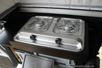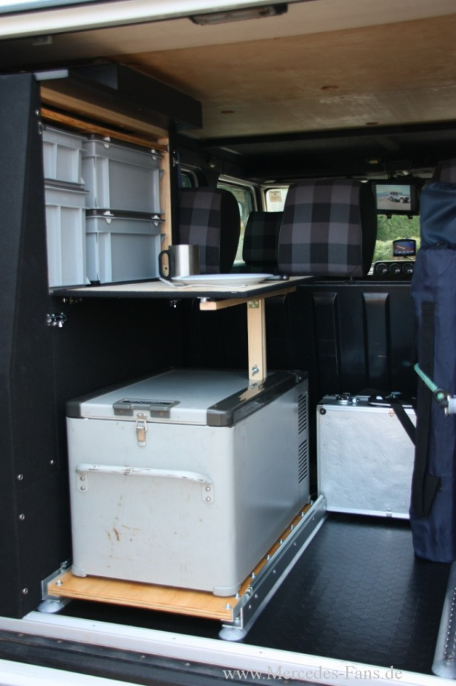 Zur Ladungssicherung dienen Airline-Schienen. Ansonsten hat Grahammer besonderen Wert auf ausreichenden Stauraum und eine Kochstelle gelegt, ein zweiflammiger Gaskocher dient zur Zubereitung warmer Mahlzeiten. Der fest eingebaute Gaskocher war in Schweden Voraussetzung zur Anmeldung des Fahrzeugs als Wohnmobil. Geplant ist es, den Kocher abnehmbar zu machen, so dass er dann im Außenbereich verwendet werden kann. Die entsprechende Konstruktion zur Befestigung des Kochers an den äußeren, in der Dachrinne eingehängten schwarzen Leisten ist bereits fertig, sie muss lediglich noch lackiert werden. Auf einem Vollauszug ist ein Engel Kompressor-Kühlschrank jederzeit gut erreichbar.