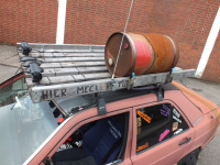 Des weiteren prägen ein Golf-3-Frontspoiler, breitere Kotflügel (AMG), Mattig-Scheinwerferblenden und Klarglas-Rückleuchten nebst dem markant-exponierten Dachgepäckträger das auffällige Erscheinungsbild.