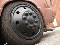 Als schiene der Mercedes ohnehin nicht schon ziemlich runtergekommen, erreicht Stefans 190E mithilfe der TA-Technix-Federn den absoluten Tiefpunkt (minus 60/40 mm). In Verbindung mit den rundum aufgesteckten Distanzscheiben (2 x 8 mm vorne und 2 x 20 mm hinten) wirkt der auf 195/55-R16 Continental-Pneus rollende Benz betont stämmig.
