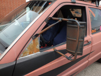 Entsprechend dient die neue Innenverkleidung aus etlichen miteinander vernieteten Kfz-Kennzeichen weniger der wohnlichen Behaglichkeit, denn vielmehr als weiterer visueller Gag. Zudem fällt der Eigenbau-Schalthebel mitsamt des freigelegten Gestänges ins Auge.