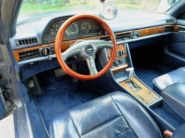 Innenraum: Raid-Lenkrad, Drehzahlmesser mit Highlight, Zusatzinstrumente im Radioschacht, Lorinser-Tacho bis 300 km/h, T-Stifter