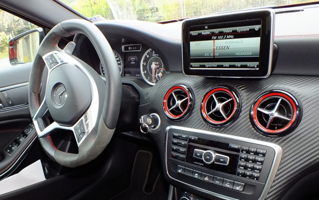 Die Kabine begeistert mit einer ebenso prickelnd designten wie funktional strukturierten Architektur, hochwertigen Materialien und attraktiven Accessoires wie Sportlenkrad, Kombi-Instrument oder Sportsitzen, welche auch den “kleinen“ W176 zu einem waschechten Mercedes-AMG aufwerten.