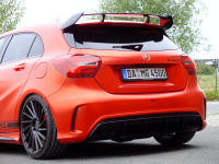 Karosserie: Mercedes-AMG A45 mit Frontschürze nebst Splits, Heckschürze mit Diffusor (Facelift), Night-Paket (Spoilerlippe und Spiegelkappen in Glanzschwarz), Facelift-Rückleuchten, Folierung in Chrome-Red-Matt