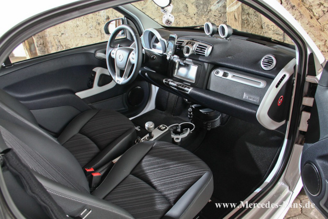 Innenraum: Individuell angefertigtes Knie-Pad auf der Fahrerseite, Brabus Zusatzinstrumente, Tachorahmen und Verkleidungsteile der Mittelkonsole weiß lackiert, Smart-Gurtpolster, Brabus Handbremshebel, Brabus Schaltknauf, Brabus Fußmatten, Car-Hifi: Smart navigation/multimedia Komplettsystem