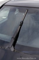 Das Finish der Frontpartie verfeinert der schwarz lackierte Kühlergrill. Ehrenvoll blieb der verchromte Stern auf der Haube erhalten. Von optischen Anleihen an die DTM zeugt ferner die zentrierte Ruhestellung des Einarmwischers auf der Windschutzscheibe. Dieser ist frei programmierbar und kann jederzeit in die übliche Ausgangsposition gestellt werden.