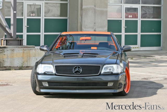 Die Frontansicht des R129 ziert heute eine mittlerweile seltene Brabus Frontschürze. Und auch die Nebelscheinwerfer sowie der Mercedes-Stern im Kühlergrill fanden ihren Weg zurück an den Benz. In Sachen Räder und Fahrwerk gab es eigentlich keinen Handlungsbedarf, die 80 Millimeter Tieferlegung reichen locker aus und auch die Dimensionen der MAE-Räder stimmen mit ihren 10 und 11x19 Zoll.