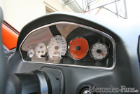 Innenraum: kompletten Innenraum neu mit schwarzen und orangen Leder bezogen, alle Holzeinlagen lackiert, 34-mm Raid Airbag-Lenkrad, Tachoscheiben Einzelanfertigung, Carbon-Schalthebel, Sitze mit AMG-Emblem, schwarzer Teppichboden, Türfächer mit schwarzem Leder, Mittelkonsole orange lackiert, SL Pedalerie, Carbon-Mittelarmlehne, Carbon-Spiegeldreiecke, Carbon-Tachoringe, SLK-Schaltrahmen, Verkleidungen im Kofferraum fast alle entfernt, Kofferraum auslackiert, Trennwand zum Tank poliert, Schrauben vergoldet, Ladekante mit Alcantara bezogen, sämtliche Innenteile lackiert, rote LED-Beleuchtung