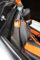 Sitze, Türverkleidungen, Säulenverkleidungen und sogar die Fußmatten wurden mit schwarzen oder orange-farbenen Leder bezogen. Kein dezenter, aber ein auffälliger und perfekt auf das gesamte Fahrzeugdesign abgestimmter Look. Das wird nicht zuletzt dank der vielen orange lackierten Kunststoffteile im Innenraum deutlich. Und natürlich findet man auch hier wieder reichlich Carbon im Bereich der Mittelkonsole oder der Sitzverkleidungen.