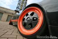 Räder: MAE-Felgen, Felgenstern in Carbon, Außenbetten orange lackiert, vorn in 10J x 19 ET plus 40er Spurplatten, hinten 11J x 19 ET 40 plus 50er Spurplatten