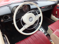 Karosserie: Radläufe gezogen, Chromleisten für Dach in Eigenbau gefertigt, Lackierung in Signalrot (Original)